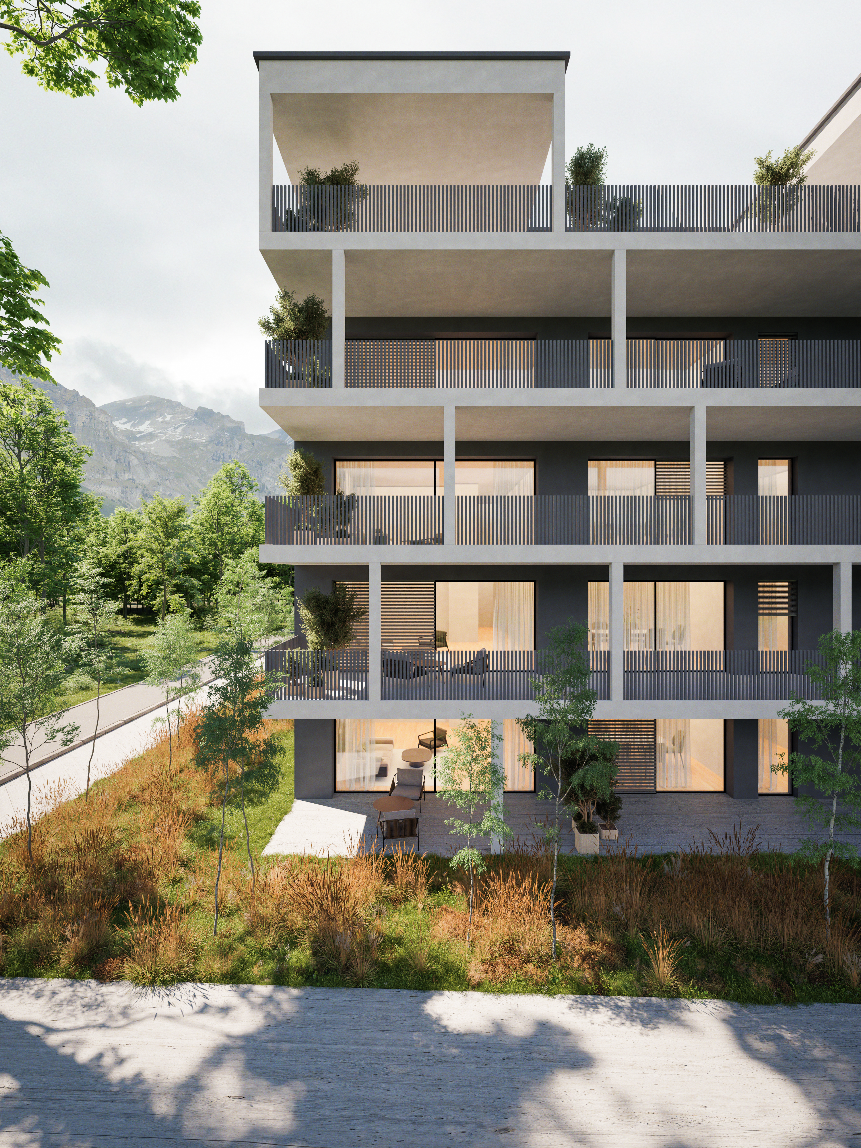 La conception architecturale met en valeur des lignes épurées et une intégration harmonieuse grâce à des aménagements paysagers soignés autour du bâtiment et sur les balcons.